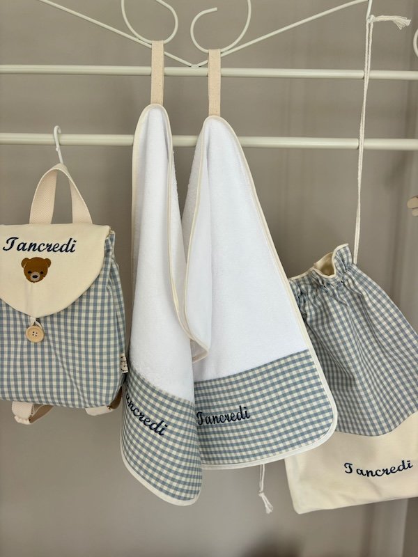Il nostro Set Asilo è pensato per accompagnare i più piccoli con tutto il necessario, unendo praticità e un dolcissimo design artigianale. Ogni pezzo è realizzato con cura e attenzione ai dettagli, con tessuti morbidi, resistenti e personalizzabili con il nome del bambino. Perfetto per rendere ogni giornata unica e organizzata!