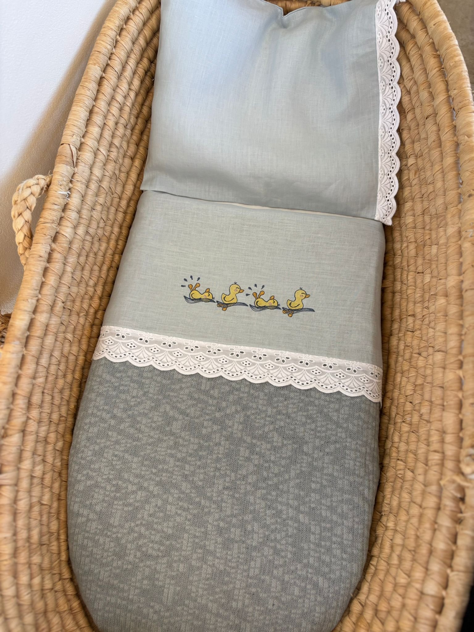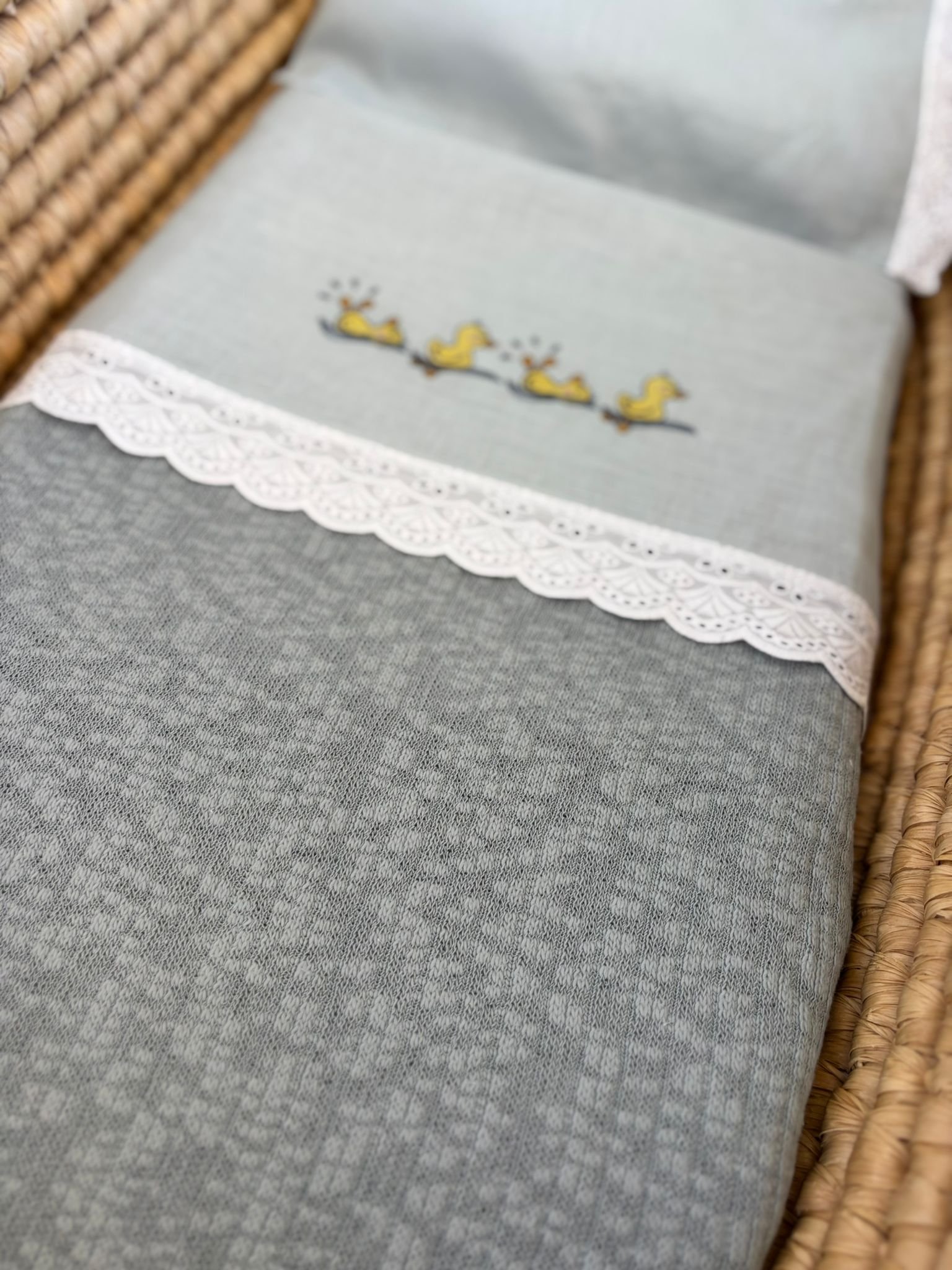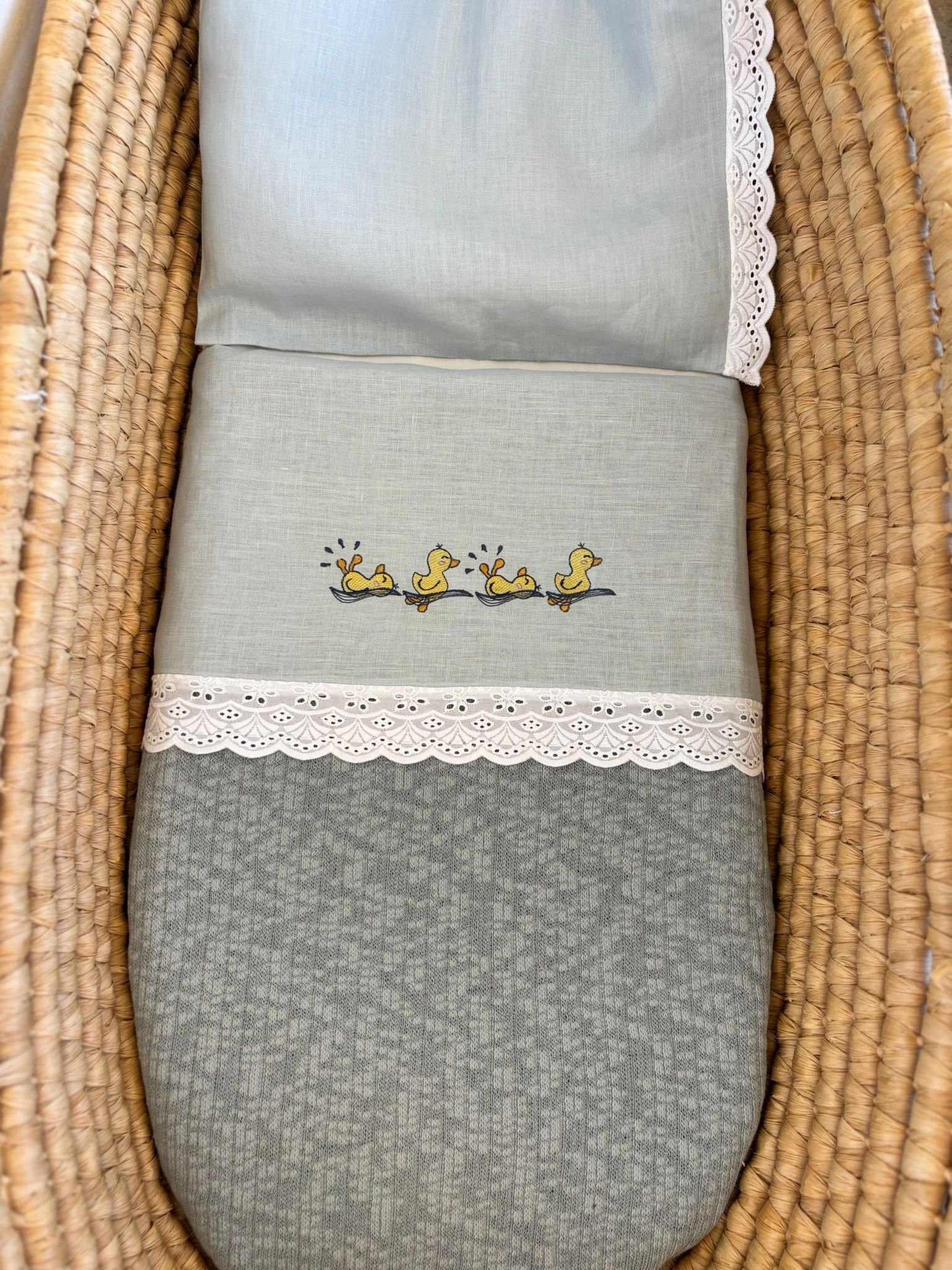 Lenzuolo sopra in puro lino azzurro polvere e sangallo con ricamo paperelle
